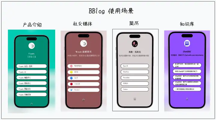 下面介绍了产品介绍、社交媒体、简历、知识库等多种场景下,使用 BBlog 聚合展示链接的分享效果。