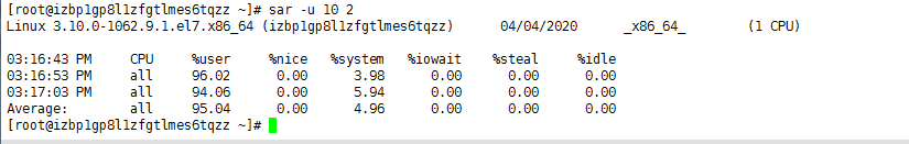 sar -u 10 2 每10秒采样一次,连续采样2次,观察CPU的使用情况;