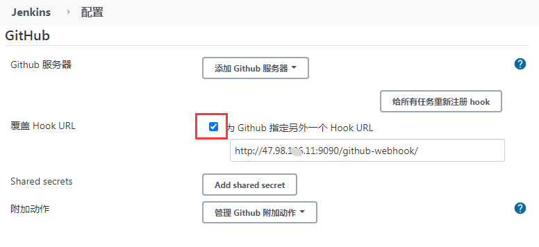 勾选为Github 指定另外一个Hook URL,这里的地址:http://ip:端口/github-webhook/,记住这个地址,后面在github的webhook设置同一地址;