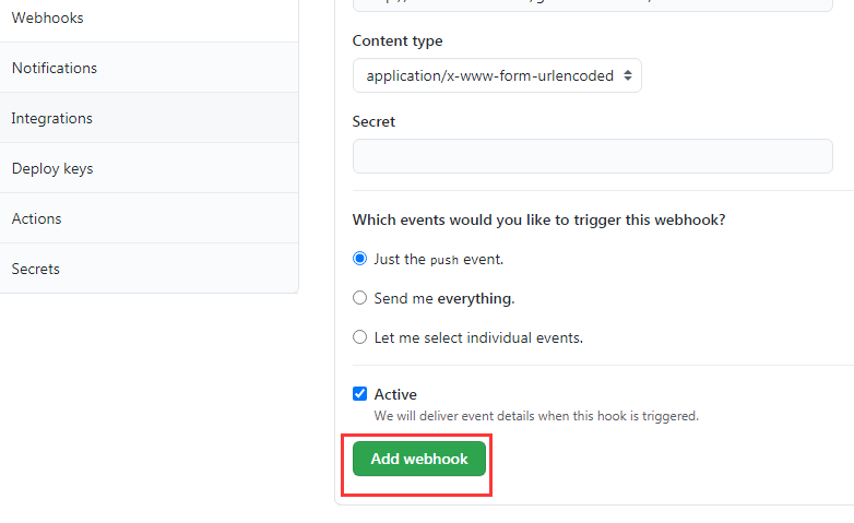 - Which events would you like to trigger this webhook? 选择仅push过去代码的时候触发:Just the push event;(尝试手动上传文件,也可以触发)