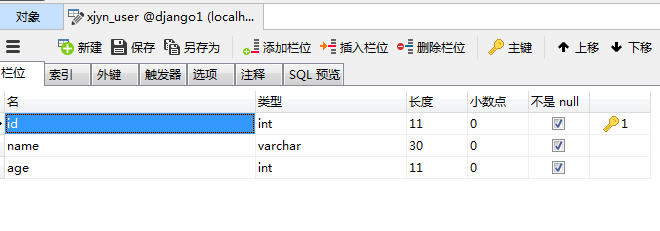 编辑models.py文件,比如我想新增一张user表,有2个字段:name、age。name是字符串类型,age是int类型