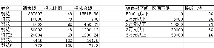vlookup 模糊查找,可以算销售提成比例,提成金额;=VLOOKUP(C37,$H$37:$I$41,2)*C37;