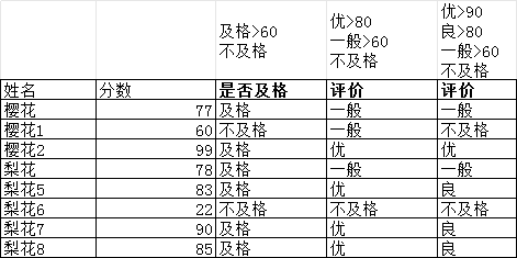 =IF(H67>90,"优",IF(H67>80,"良",IF(H67>60,"一般","不及格")));