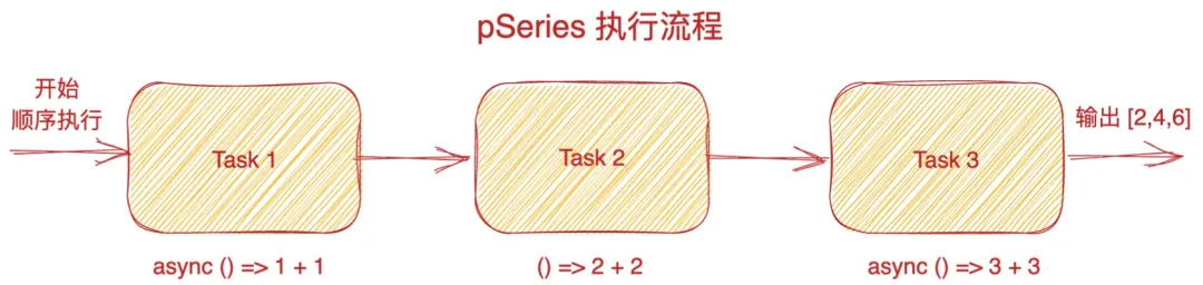 在以上示例中,我们创建了 3 个任务,然后使用 pSeries 函数来执行这 3 个任务。当以上代码成功执行后,命令行会输出 「[ 2, 4, 6 ]」。对应的执行流程如下图所示: