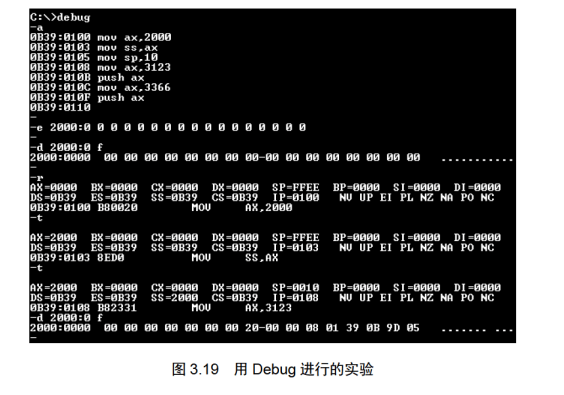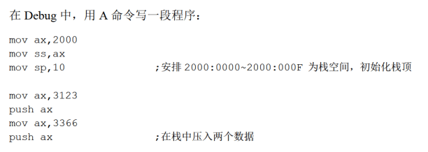 这两条指令执行后靠近栈顶的10个字节中值立即有了变化,是对定义栈段时部分运行环境变量进行暂存,靠近栈顶的10个字节中的暂存数据分别是SS、IP、 CS 等的值。