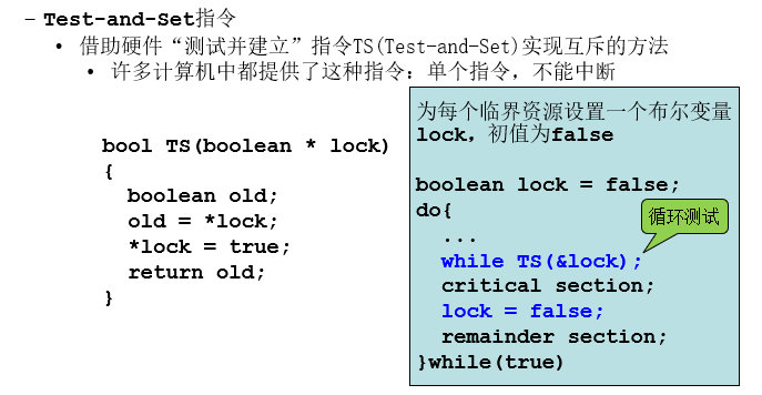 进程进入临界区之前,用TS指令测试lock,如果其值为FALSE,表示没有进程在临界区内,可以进入,并将TRUE赋给lock,即关闭了临界资源,使任何进程不能进入临界区,循环测试直到TS(s)为TRUE。