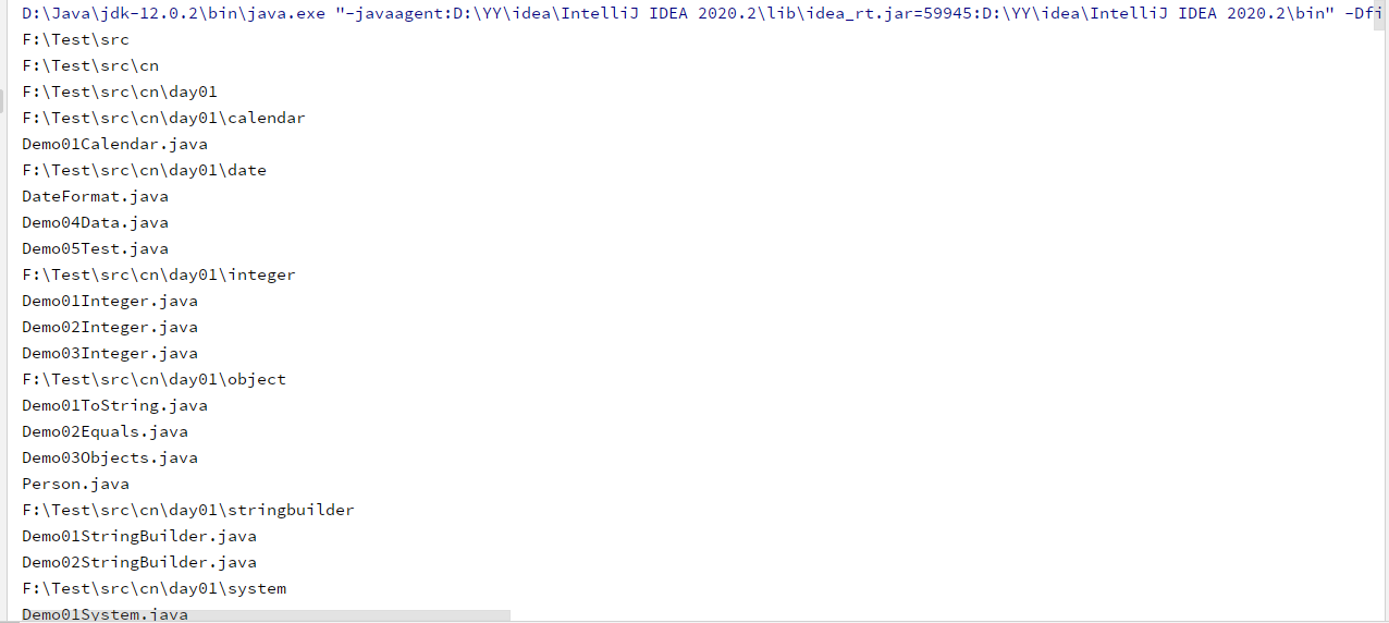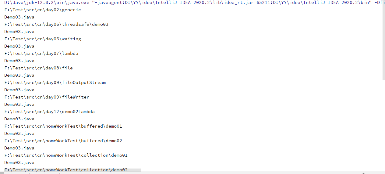 1 package cn.homeWork01.demo06Recurison; 2 3 // 目录遍历及搜索并删除此非空文件夹 4 5 import java.io.File; 6 7 public class Demo01 { 8 public static void main(String[] args) { 9 // 此文件夹为进行操作的文件夹 10 File file = new File("F:\\Test\\src"); 11 // 调用遍历文件夹的方法 12 //printFile(file); 13 // 调用搜索文件方法 14 // 此处须切换47——50行处代码实现不同方式的查找 15 // 当前方法为按文件名精确查找 16 search(file,"Demo03.java"); 17 // 此处为按文件后缀查找 18 //search(file,".java"); 19 // 调用删除文件夹方法 20 //delete(file); 21 } 22 23 // 遍历文件夹 24 public static void printFile(File file){ 25 File[] dirs = file.listFiles(); 26 // 输出文件夹的绝对路径 27 System.out.println(file); 28 for (File dir : dirs) { 29 if(dir.isDirectory()){ 30 // 调用递归,逐层搜索 31 printFile(dir); 32 }else{ 33 // 输出文件名称 34 System.out.println(dir.getName()); 35 } 36 } 37 } 38 39 // 按条件查找 40 public static void search(File file,String name){ 41 File[] dirs = file.listFiles(); 42 for (File dir : dirs) { 43 if(dir.isDirectory()){ 44 // 调用递归,逐层搜索 45 search(dir,name); 46 }else // 按文件名精确查找 47 if(dir.getName().equals(name)){ 48 49 // 按后缀查找 50 //if(dir.getName().toLowerCase().endsWith(name)){ 51 // 输出文件夹的绝对路径 52 System.out.println(file); 53 // 输出文件名称 54 System.out.println(dir.getName()); 55 } 56 } 57 } 58 59 // 删除文件夹 60 public static void delete(File file){ 61 File[] dirs = file.listFiles(); 62 for (File dir : dirs) { 63 if(dir.isDirectory()){ 64 // 调用递归,逐层删除 65 delete(dir); 66 }else{ 67 // 删除文件 68 boolean b = dir.delete(); 69 System.out.println(dir.getName()+" 删除状态:"+b); 70 } 71 } 72 // 删除文件夹 73 boolean b = file.delete(); 74 System.out.println(file.getName()+" 删除状态:"+b); 75 } 76 }