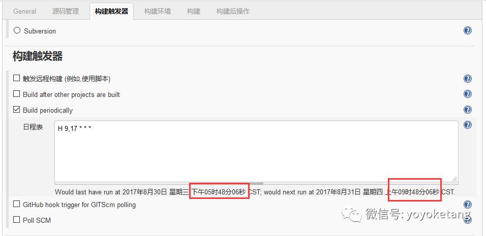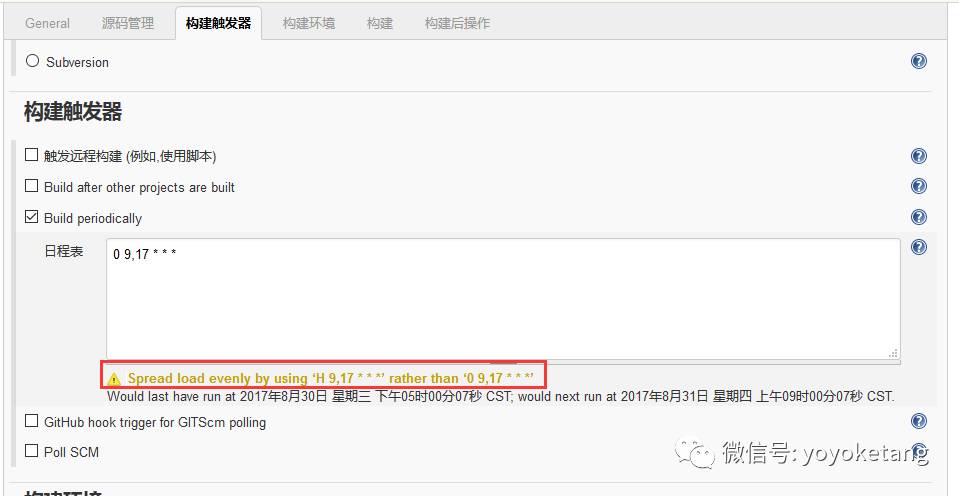 3.上面红色字体:Spread load evenly by using ‘H 9,17 * * *’ rather than ‘0 9,17 * * *’,这句话大概意思就是说,用这个语法会比后后面那个好:H 9,17 * * *