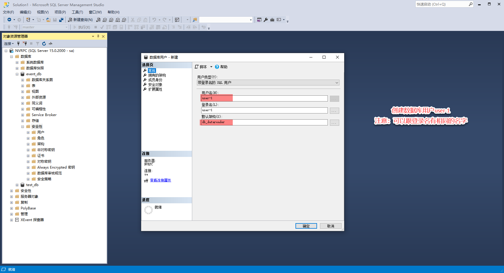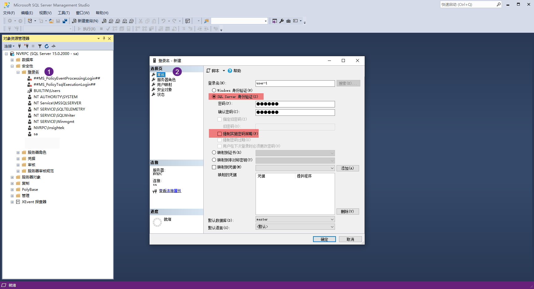 通过超级管理员账户 sa 创建普通登录账户(即普通登录名): user-1,登录密码:123456