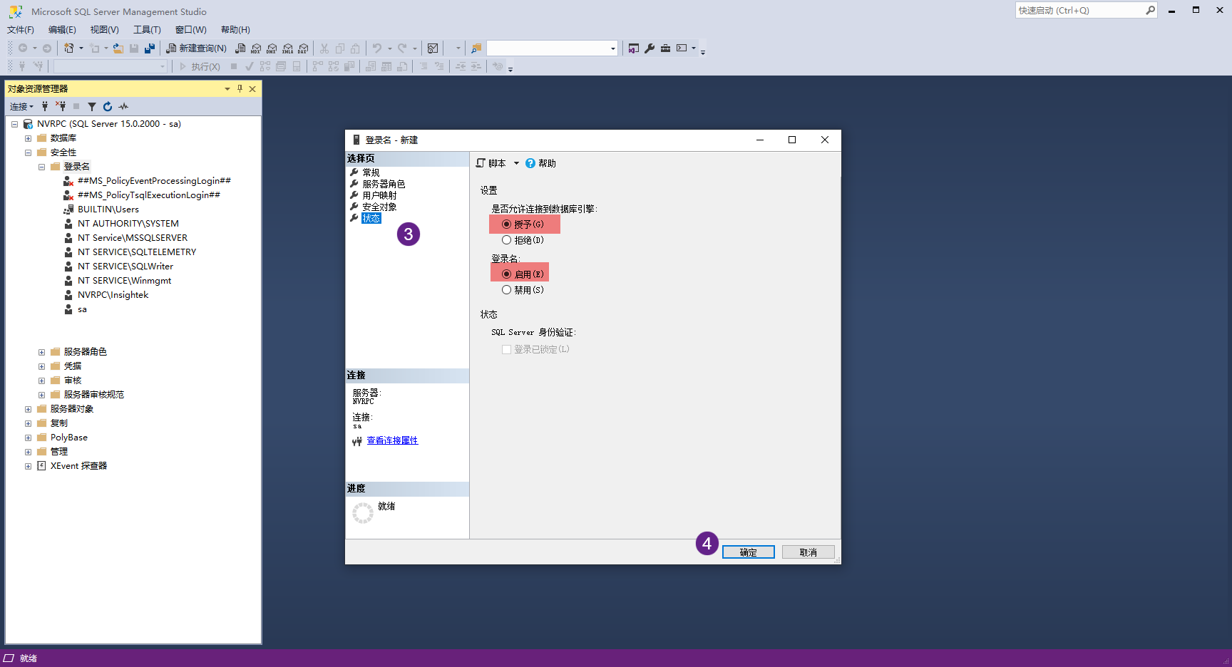 注意:新建登录名过程中,重点注意 选择页-常规 和 选择页-状态