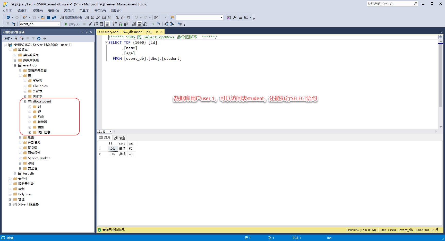 给数据库用户 user-1 添加表 student 的权限,权限范围:选择