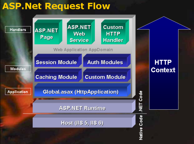 模块是相当底层的,而且对每个来到ASP.NET应用程序的请求都会被触发.Http处理器更加的专注并处理映射到这个处理器上的请求.