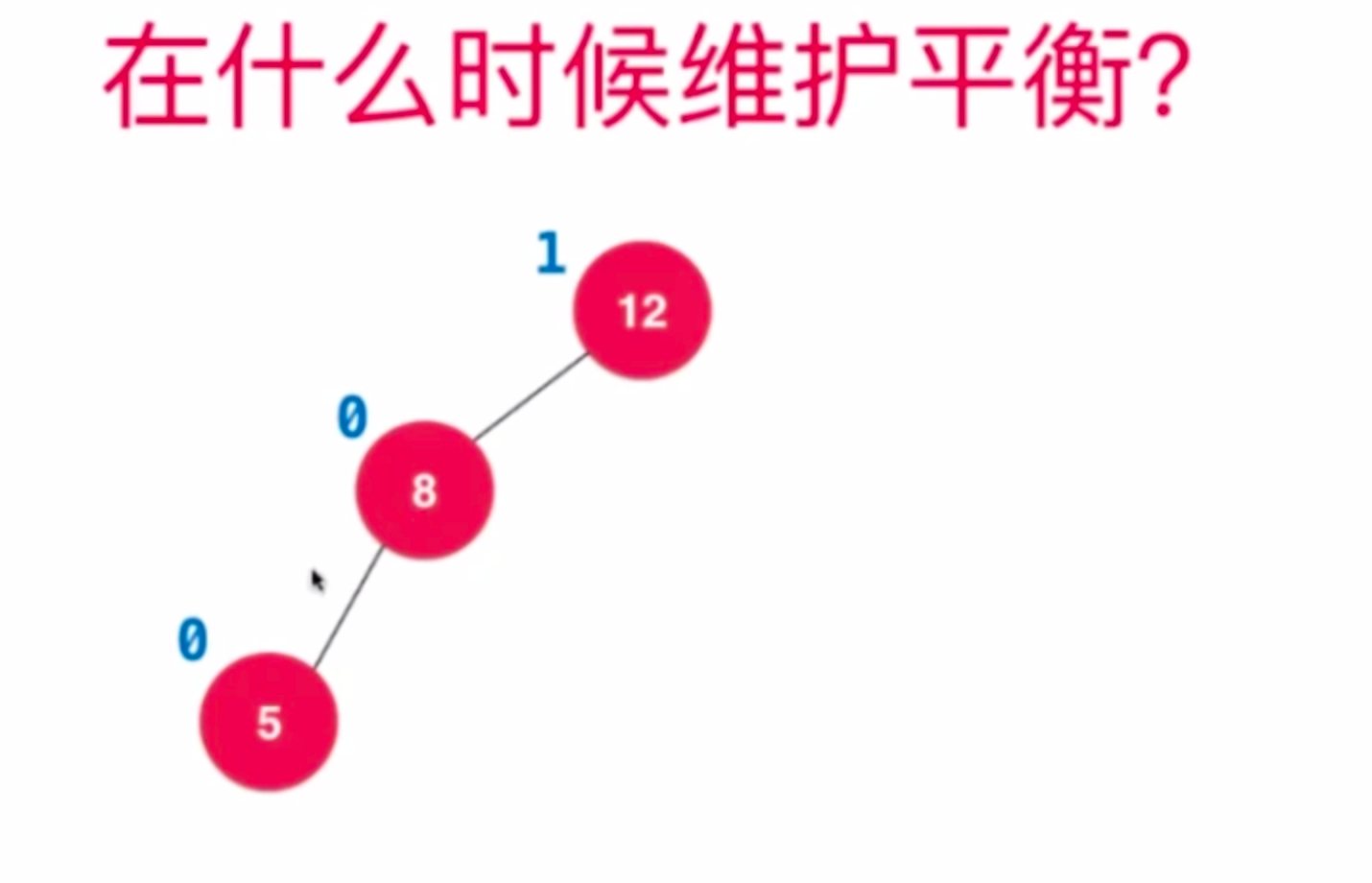 5<8 往左边插入 此时12 的 高度为3 平衡影子为2 此时已经是不平衡的树了。