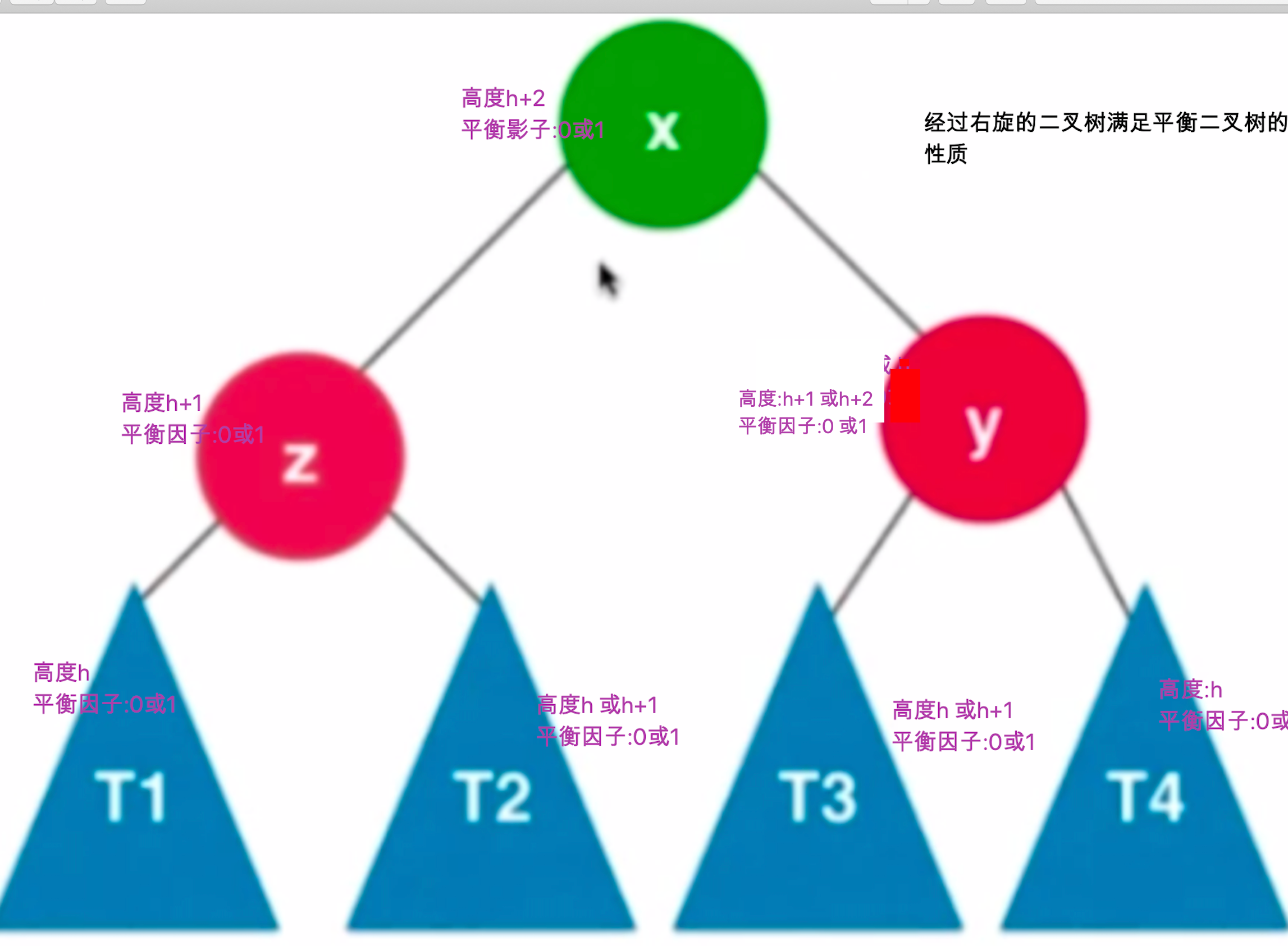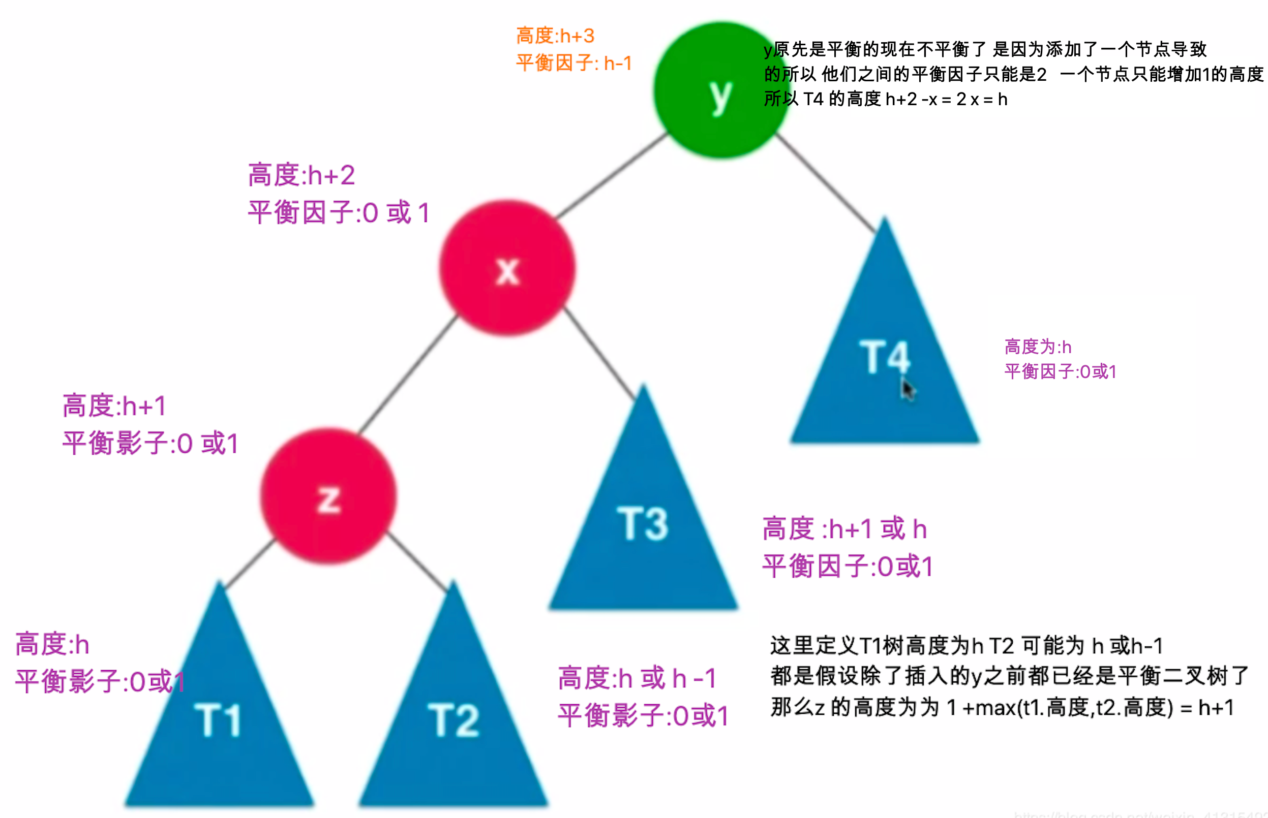 既然y比T3小 那为什么不放在t3的左子树下面呢 如果这么做 就变成2h+1 当t3取 h+1 时 t3+ y + t4 = h+1 +1 + h = 2h+2 此时T4 没有了 t3 只有1的高度 只有h取到0时才能满足平衡二叉树的性质。