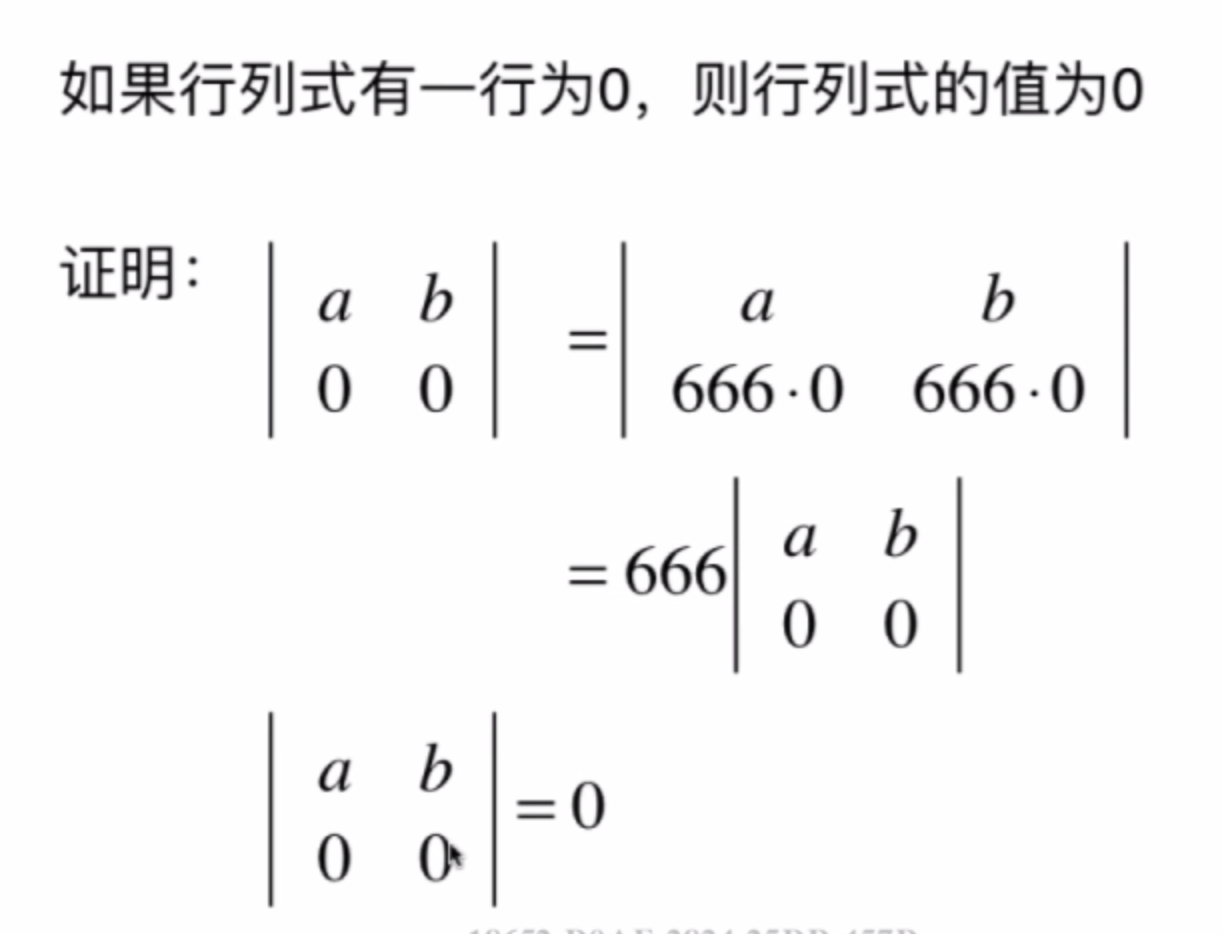 如果行列式的一行是其他行的线性组合,则行列式的值为0。