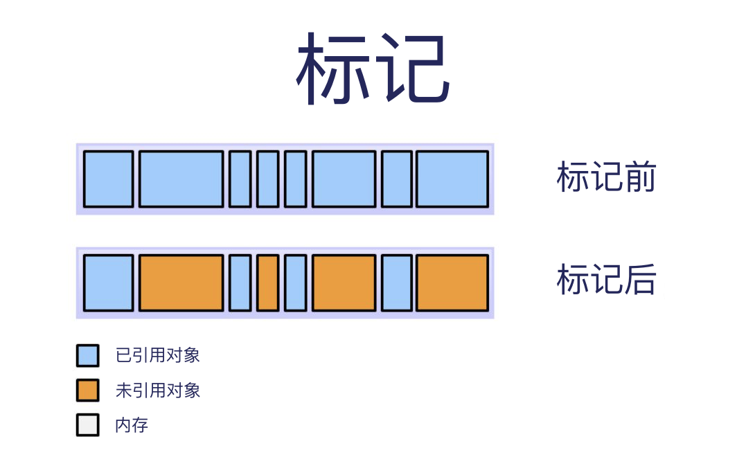 标记:垃圾回收器此时会找出内存哪些在使用中,哪些不是。垃圾回收器要检查完所有的对象,才能知道哪些有被引用,哪些没。如果系统里所有的对象都要检查,那这一步可能会相当耗时间。