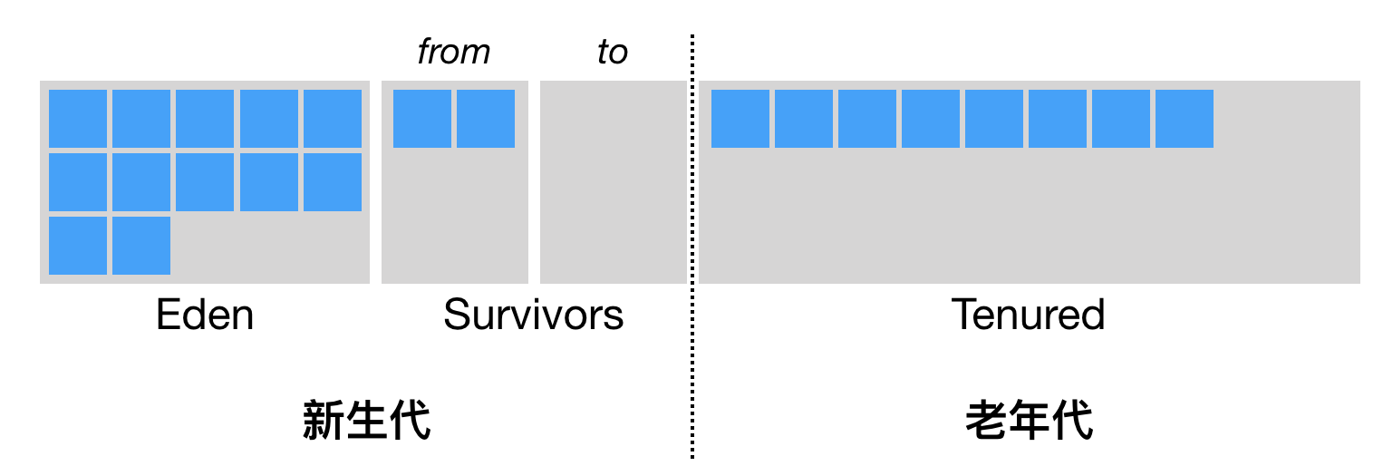 Java虚拟机将堆划分为新生代和老年代。其中,新生代又被划分为Eden区,以及两个大小相同的Survivor区。