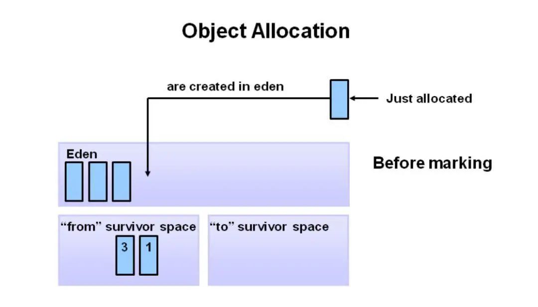 首先,将任何新对象分配给 eden 空间。两个 survivor 空间都是空的。