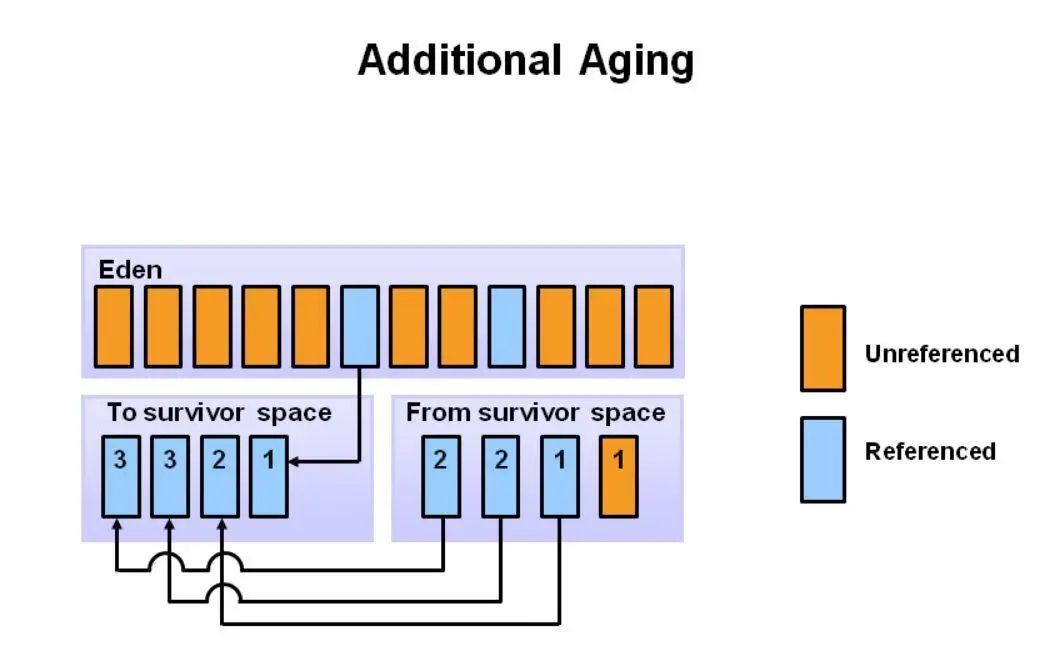在下一次Minor GC中,会重复同样的操作。不过,这一次Survivor区会交换。被引用的对象移动到S0,。幸存的对象增加年龄。Eden区和S1被清空。