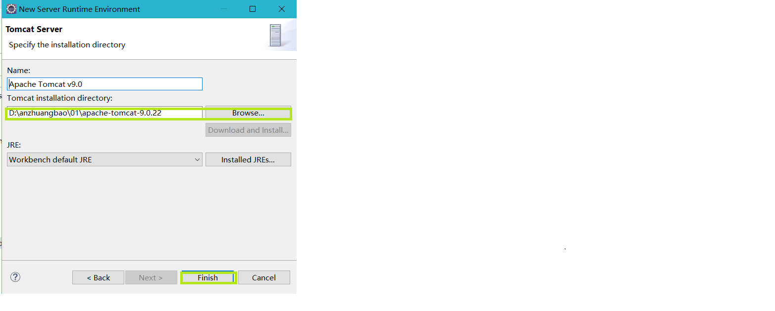 第一次的话可能。需要在 Tomcat installation driectory 处选出刚才解压好的文件夹。需要选到文件的上一层文件夹,在确定。