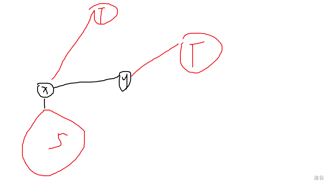 如果我们连接了 \(rt\) 和红色节点,那么我们就要连两条边,方案如下(蓝色是新连的边):