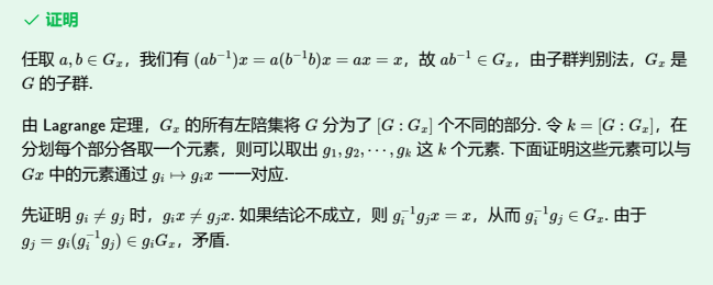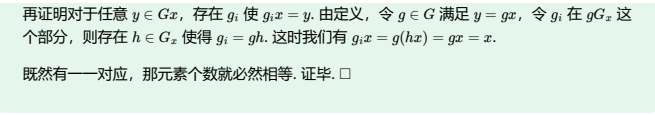 对于 \(\forall x\in X\),\(Gx\) 为 \(G\) 的子群,且 \(|G_x||Gx|=|G|\)。