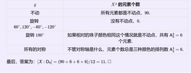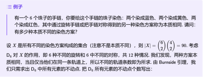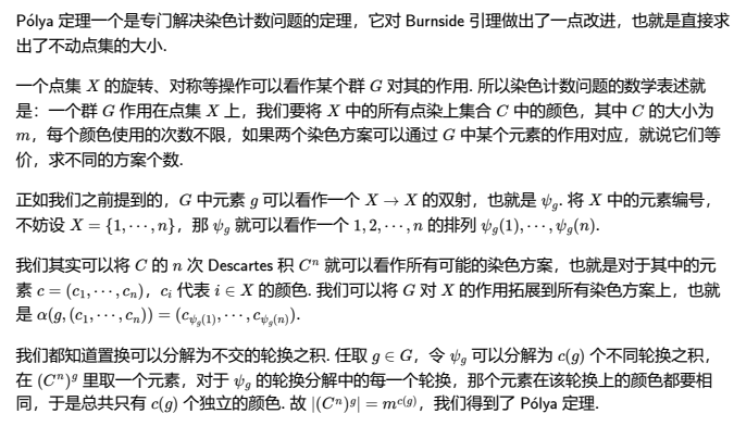 在上述内容中,可以与前文的 Burnside 一起进行理解。 \(C^n\) 是不保证本质不同的染色数,\(G\) 就是可以进行的旋转方式的集合。
