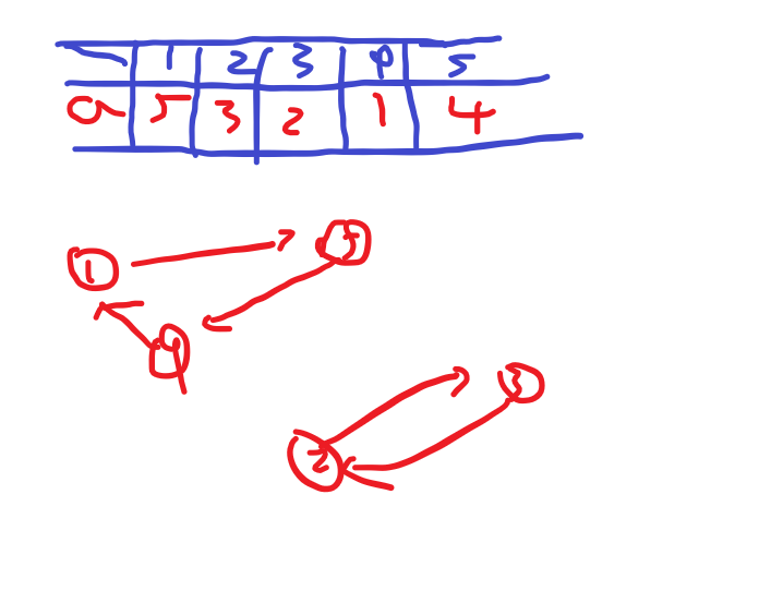 主要就是要注意一下 \(c\)。对于一个置换(或者说排列) \(p\),\(c(p)\) 为该置换所生成图中环的数量,如下图就是一个 \(c(p)=2\) 的排列: