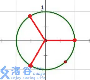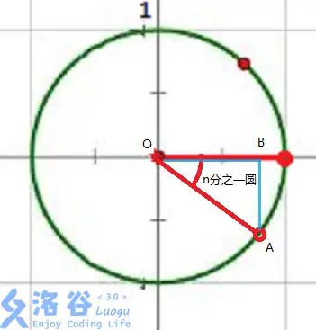 其 \(\frac{1}{n}\) 圆所对的角度就是 \(\frac{2\pi}{n}\),所以其终边的坐标就是 \((\cos \frac{2\pi}{n},\sin \frac{2\pi}{n})\),其单位根就是 \(\cos \frac{2\pi}{n}+i \cdot \sin \frac{2\pi}{n}\)。