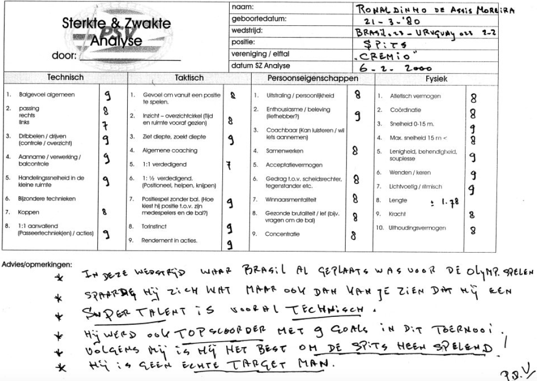 罗纳尔多:在一场小比赛中,被荷兰球探 Piet de Visser(彼得·维瑟)发现。