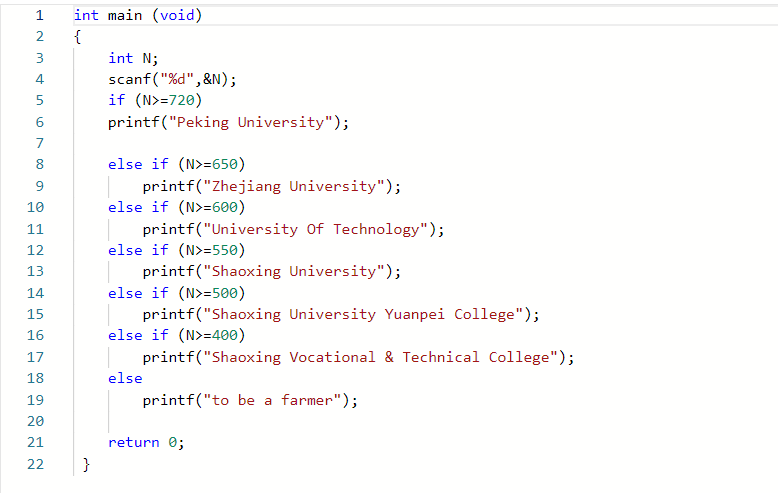* 高考结束不久,各校的入取分数线也出来了,北京大学(Peking University)720,浙江大学(Zhejiang University)650,工业大学(University Of Technology)600,文理学院(Shaoxing University)550,文理学院元培学院(Shaoxing University Yuanpei College)500,绍兴职业技术学院(Shaoxing Vocational & Technical College)400,张三的分数为n,请问张三能去哪个大学? 如果分数低于400,则回家种地(to be a farmer)。