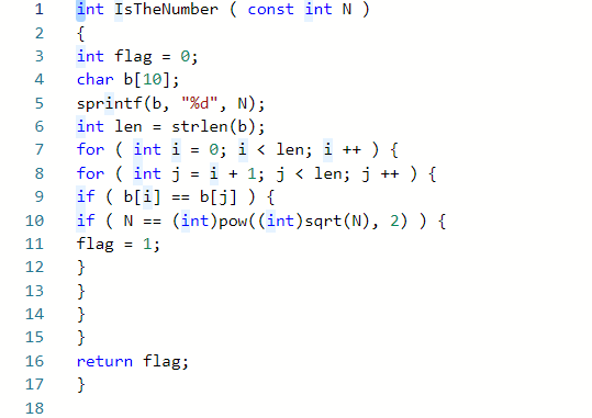 * 本题要求实现一个函数,判断任一给定整数N是否满足条件:它是完全平方数,又至少有两位数字相同,如144、676等。