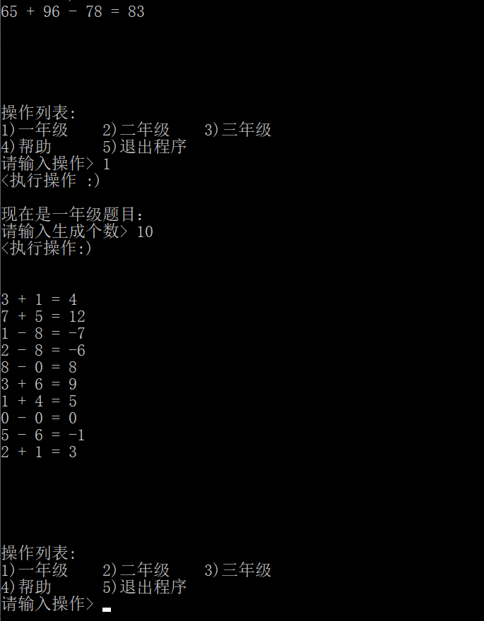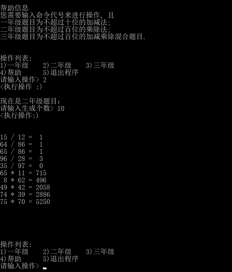 | 这个作业的目标是 | 使用上次作业的菜单框架,并在其基础上增加各年级题目操作函数 |