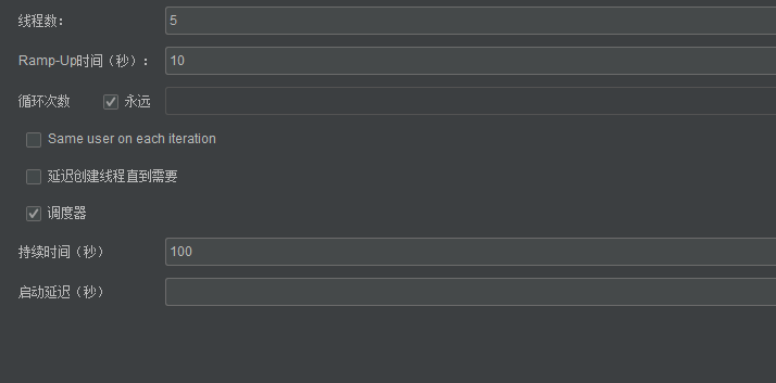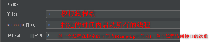 线程数: 模拟线程数 Ramp-Up时间(秒): 指定的时间内启动所有的线程 循环次数: 每一个线程在指定的时间内(Ramp-Up时间内),单个线程访问接口的次数