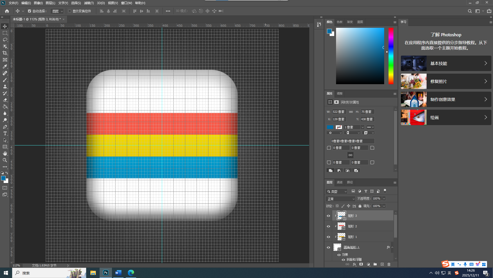 3. 绘制底座的矩形,选择矩形工具绘制一条宽为522px高为75px的矩形,颜色分别为#e9352b,#d69d03,#006da6并创建剪贴蒙版