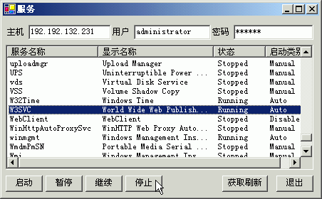 在Win32ServiceManager中通过RemoteConnectValidate静态方法来测试连接成功与否;另外提供了GetServiceValue方法和GetServiceList方法以及它的重载来获取服务信息;后面的四个方法就是对服务的状态控制了。