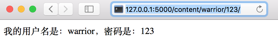 需要注意的是,上面<>里面写的参数名称必须和你def函数里传参名称相同,比如我写的参数名叫username,那么我代码里login后面的形参名称必须叫username,上面代码我传了两个参数,地址写的时候分别传了warrior和123。