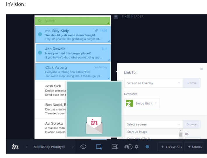 这一类工具是UI设计师的交互演示利器,此工具是在网页端进行设计。交互的设置上多以创建热区为基础,点击热区跳转页面为主要功能,几乎不需要任何学习成本,也没有什么操作难度,而且由于具有协作功能等原因,InVision显现出更加优秀于同类型产品的一面。
