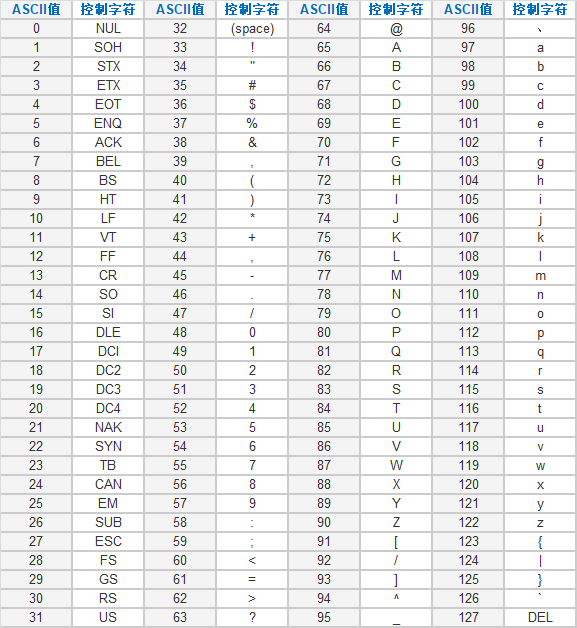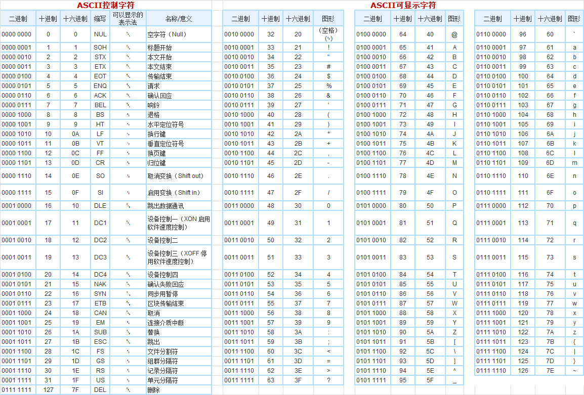 ASCII第一次以规范标准的型态发表是在1967年,最后一次更新则是在1986年,至今为止共定义了128个字符,其中33个字符无法显示(这是以现今操作系统为依归,但在DOS模式下可显示出一些诸如笑脸、扑克牌花式等8-bit符号),且这33个字符多数都已是陈废的控制字符,控制字符的用途主要是用来操控已经处理过的文字,在33个字符之外的是95个可显示的字符,包含用键盘敲下空白键所产生的空白字符也算1个可显示字符(显示为空白)。