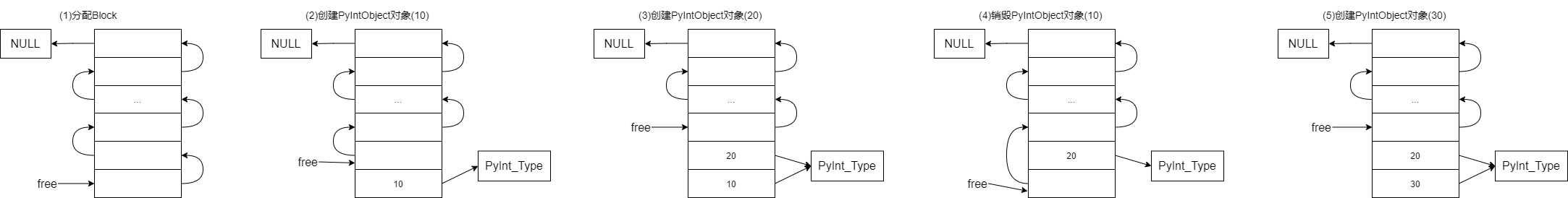 将PyIntBlock内整数对象数组中的各个对象,从后往前将整数对象串联起来(ob_type字段),方便取用和回收。将PyIntBlock中最后的PyIntObject对象指针返回。
