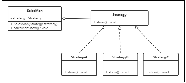 .抽象策略(Strategy)类:这是一个抽象角色,通常由一个接口或抽象类实现。此角色给出所有