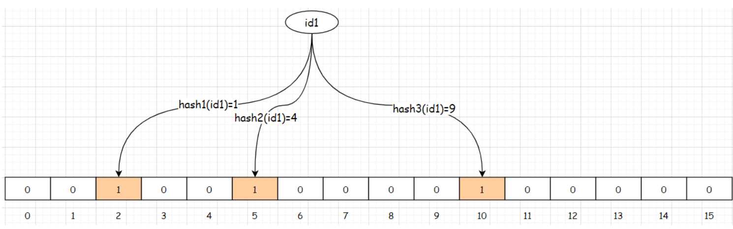假设当前的布隆过滤器中提供了三个hash函数,此时就使用三个hash函数对id1进行哈希运算,运算结果分别为:1、4、9那么就会数组中对应的位置数