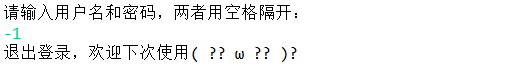 2、在退出登录时,第一次输入“-1“为退出账号登录,在此界面下还可以输入其它的账号和密码进行登录。第二次输入”-1“为退出登录界面,此时相当于退出整个系统。在使用命令行进行输入时,这样的设计于用户而言比较友好,符合用户的使用习惯。