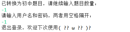 2、登陆后,对输入的信息进行判断。若输入为范围为10-30的数字,则进行出卷操作;若输入为-1,则退出登录并返回到登录界面;若输入为切换为小学/初中/高中,则切换出题类型。
