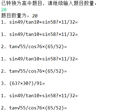 1、在生成对应的类型题目的过程中,题目保存在txt文档之余,在控制台还会会反复输出部分题目。出现问题的原因是在生成某一个题目的过程中对已经生成的每一个式子都进行了输出,导致存在许多冗余的输出。个人认为,生成的题目不必在控制台显示出来,只要保存在txt文档中就好。