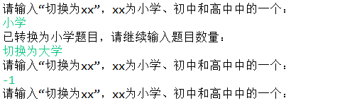 3、切换出题类型时,若输入不为小学/初中/高中,则提示用户选择三者中的一个。