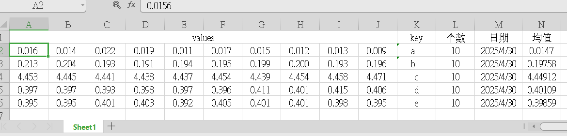 有下面一个的简单测试表格,A-J列为3位或者4位小数,N列为公式计算结果。