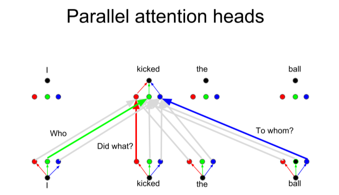 - 但是对于self-attention,我们使用的combination,相当于对于所有位置应用了一样的线性变换(对于所有位置 \(a_i\) 都是应用了三种相同的线性变换到 \(q_i\) 、 \(k_i\) 和 \(v_i\),一样的 \(W_q\)、\(W_k\) 和 \(W_v\)),可以把一个attention layer看作某种feature detector,我们如果想学习多个“feature”,就需要多个heads(下图右,就是3-heads,分别用三组 \(W_q\)、\(W_k\) 和 \(W_v\) 进行了3次投影线性变换),每一个head就是a function of positions,以此来模拟convolution卷积。