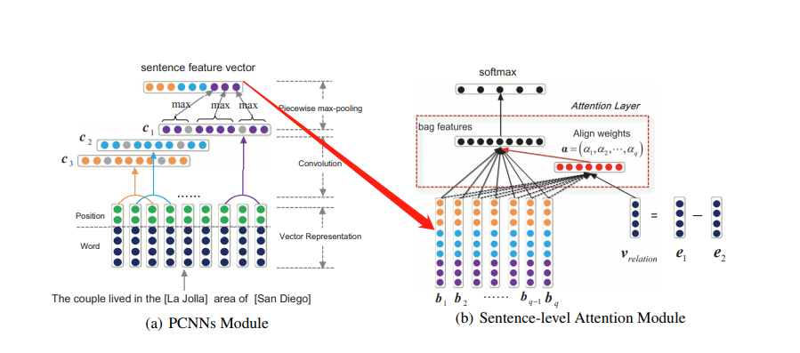 APCNNs=PCNNs + Attention Module,PCNN模块:用来从包里抽取出实例的特征向量,Sentence-Level Attention Module:对有效的实例分配更高的权重,对无效的实例分配较低的权重值。D:实体描述,使用传统CNN从Freebase/Wikipedia中抽取出实体特征