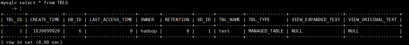 - mysql查看hive元数据表TBLS